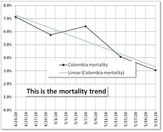 SUMMARY Colombia is likely stable. Mortality is trending normally. In fact going down faster than most. Colombia has little seasonality factor which makes them compare